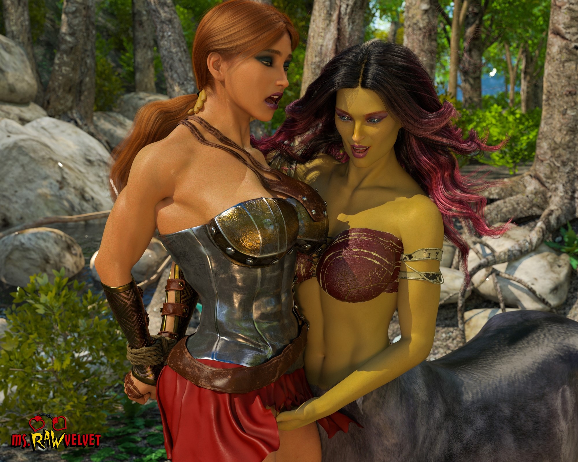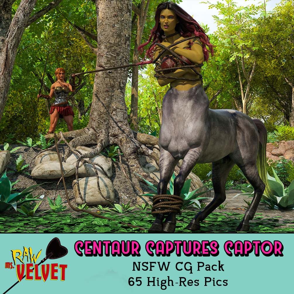 The Amazon hoped to catch the magical centaur, but the creature was too quick and too powerful. The Centaur flipped the ropes on her would-be captor, then took full advantage her vulnerable captive.